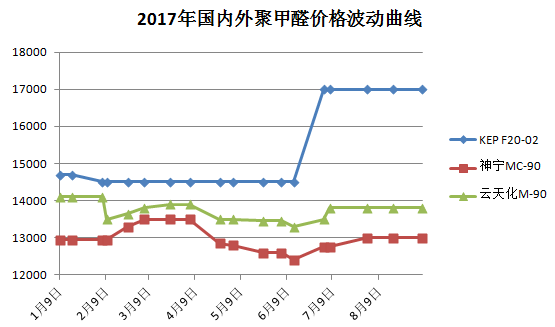 上图为2017年年初至今同类型进口和国产牌号价格走势图,分别为韩国进口KEP F20-02、神华宁煤的MC-90和云天化的M-90。由图可知,上半年韩国进口POM价格较为稳定,且价格相对于国产料更高。而国产POM由于自身产品性能的影响出现了价格波动下降的现象,与进口POM相比缺少核心竞争力。